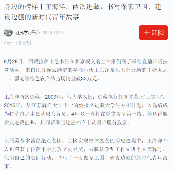 王海洋两次进藏,2009年,他大学入伍,进藏执行任务并荣记“三等功”。2016年,从江苏海洋大学毕业的他报名进藏大学生专招计划,入选后成为拉萨市尼木县基层公务员,4年多一直扑在脱贫攻坚第一线。他还说服女友进藏创业,共同帮助当地建档立卡贫困户脱贫致富。