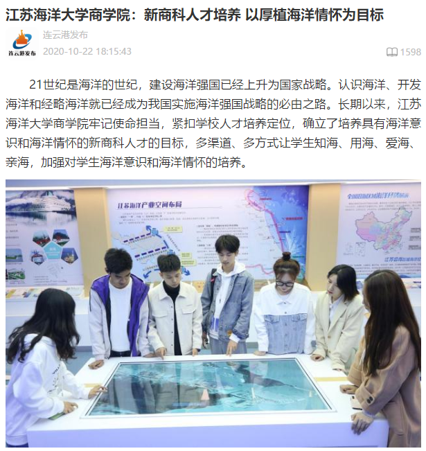 21世纪是海洋的世纪,建设海洋强国已经上升为国家战略。认识海洋、开发海洋和经略海洋就已经成为我国实施海洋强国战略的必由之路。长期以来,江苏海洋大学商学院牢记使命担当,紧扣学校人才培养定位,确立了培养具有海洋意识和海洋情怀的新商科人才的目标,多渠道、多方式让学生知海、用海、爱海、亲海,加强对学生海洋意识和海洋情怀的培养。