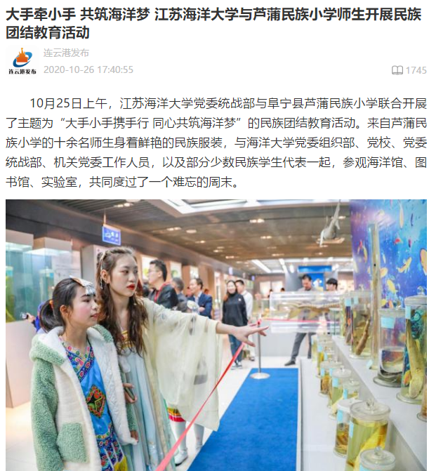 长期以来,江苏海洋大学党委非常重视以党建为引领,开展革命传统教育和民族团结教育活动,并与芦蒲民族小学建立长期友好往来关系。10月中旬,学校机关党委第二党支部赴盐城阜宁芦蒲烈士陵园开展了党员教育与民族团结教育活动,向芦浦民族小学捐赠海洋科普类、世界名著等适合小学生阅读的图书500余册。