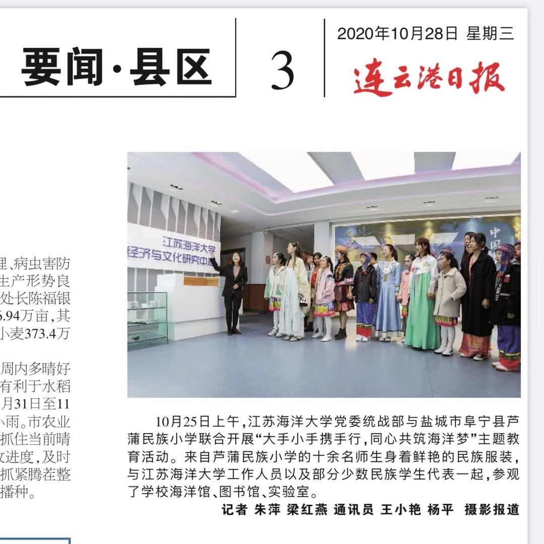 10月25日上午,江苏海洋大学党委统战部与阜宁县芦蒲民族小学联合开展了主题为“大手小手携手行 同心共筑海洋梦”的民族团结教育活动。来自芦蒲民族小学的十余名师生身着鲜艳的民族服装,与海洋大学党委组织部、党校、党委统战部、机关党委工作人员,以及部分少数民族学生代表一起,参观海洋馆、图书馆、实验室,共同度过了一个难忘的周末。