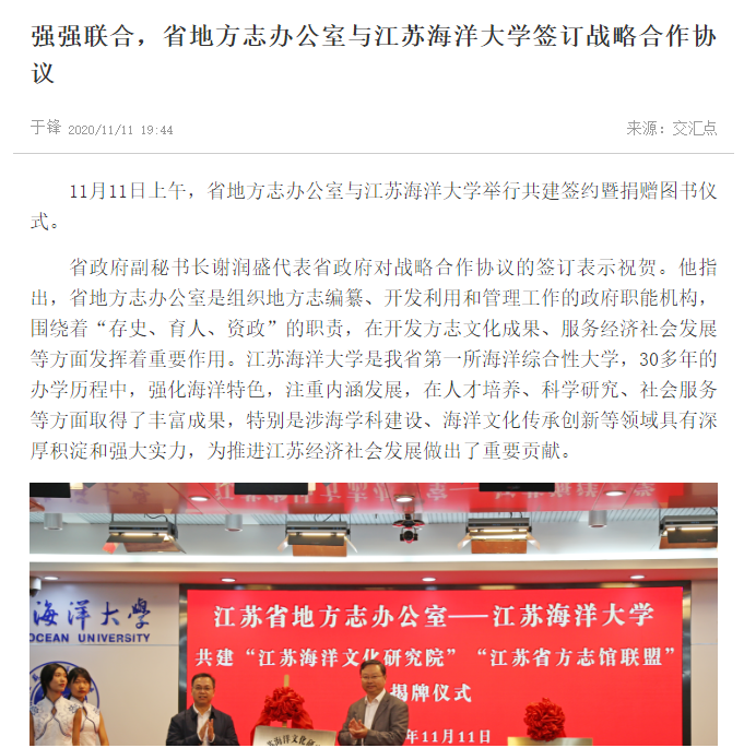双方代表签署了省地方志办公室与江苏海洋大学战略合作框架协议,将在地方志学科建设、理论研究、资源开发利用、方志文化推广等方面深化战略合作。为充分发挥双方学术人才和学术资源优势,省地方志办公室、江苏海洋大学、江苏新闻广播联合推出“海上丝绸之路江苏寻迹”专栏,省地方志办公室与江苏海洋大学合作共建“江苏海洋文化研究院”,联合开展海洋文化类课题项目研究,承接相关部门关于海洋强省建设等方面的项目。“江苏海洋大学海洋经济文化研究中心”加入“江苏省方志馆联盟”,共同打造区域特色文化品牌。左健伟、宁晓明共同为“江苏海洋文化研究院”和“江苏省方志馆联盟”揭牌。