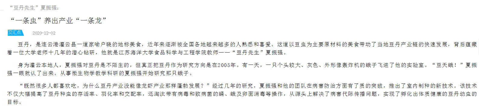 豆丹,是连云港灌云县一道家喻户晓的地标美食,近年来逐渐被全国各地越来越多的人熟悉和喜爱。这道以豆虫为主要原材料的美食带动了当地豆丹产业链的快速发展,背后蕴藏着一位大学老师十几年的潜心钻研,他就是江苏海洋大学食品科学与工程学院教师——“豆丹先生”夏振强。