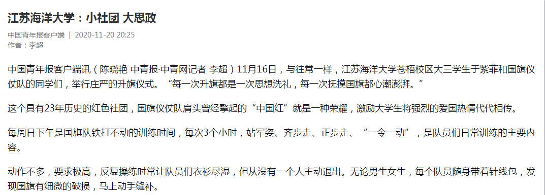 中国青年报客户端讯(陈晓艳 中青报·中青网记者 李超)11月16日,与往常一样,江苏海洋大学苍梧校区大三学生于紫菲和国旗仪仗队的同学们,举行庄严的升旗仪式。“每一次升旗都是一次思想洗礼,每一次抚摸国旗都心潮澎湃。”