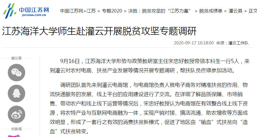 9月16日,江苏海洋大学形势与政策教研室主任宋忠好教授带领本科生一行5人,来到灌云对农村电商、扶贫产业发展等情况开展专题调研,帮扶队员佟瑛参加活动。