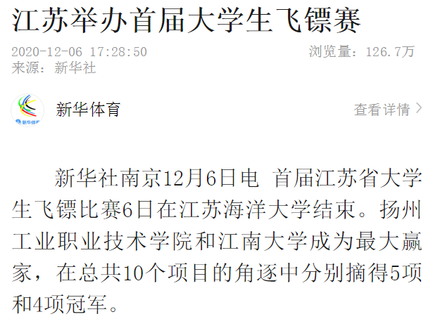 新华社南京12月6日电 首届江苏省大学生飞镖比赛6日在江苏海洋大学结束。扬州工业职业技术学院和江南大学成为最大赢家,在总共10个项目的角逐中分别摘得5项和4项冠军。