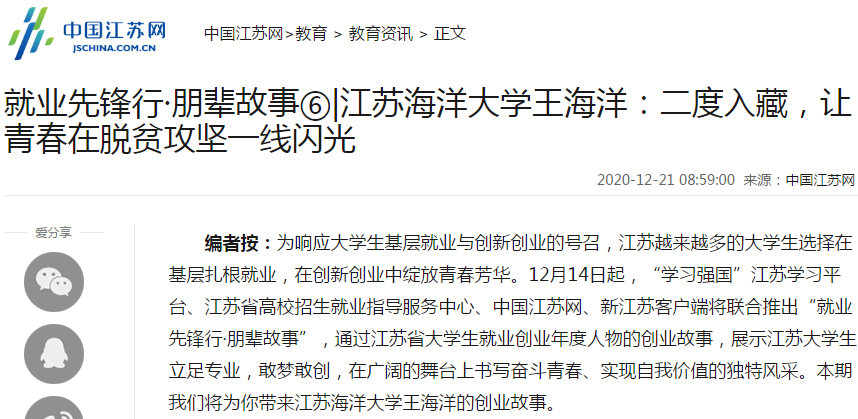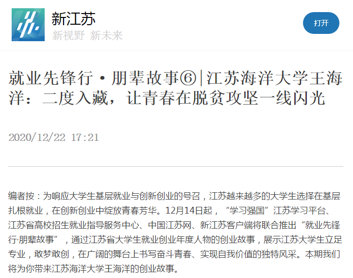 2016年7月,王海洋在复员返校完成大专、本科阶段的学业后,恰逢江苏高校内开展进藏大学生专招工作,他深刻了解西藏环境的艰苦,也深刻地知道西藏人才的稀缺。作为一名军人、一名共产党员,在祖国最需要的时候,他义无反顾地再次积极响应国家的号召,来到了祖国最需要的地方,第二次进入西藏绽放自己的青春。