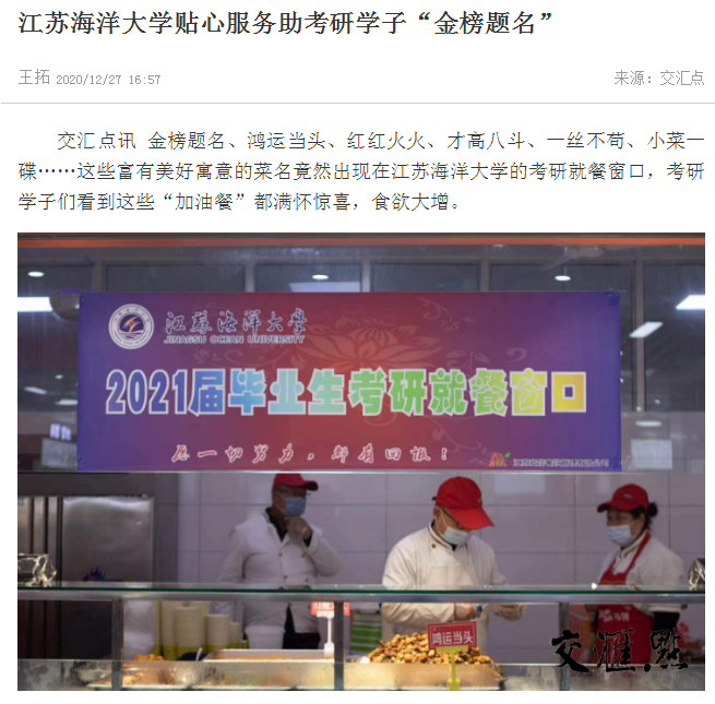金榜题名、鸿运当头、红红火火、才高八斗、一丝不苟、小菜一碟……这些富有美好寓意的菜名竟然出现在江苏海洋大学的考研就餐窗口,考研学子们看到这些“加油餐”都满怀惊喜,食欲大增。