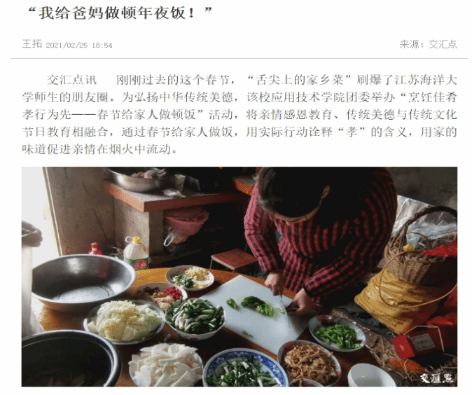 刚刚过去的这个春节,“舌尖上的家乡菜”刷爆了江苏海洋大学师生的朋友圈。为弘扬中华传统美德,该校应用技术学院团委举办“烹饪佳肴 孝行为先——春节给家人做顿饭”活动,将亲情感恩教育、传统美德与传统文化节日教育相融合,通过春节给家人做饭,用实际行动诠释“孝”的含义,用家的味道促进亲情在烟火中流动。