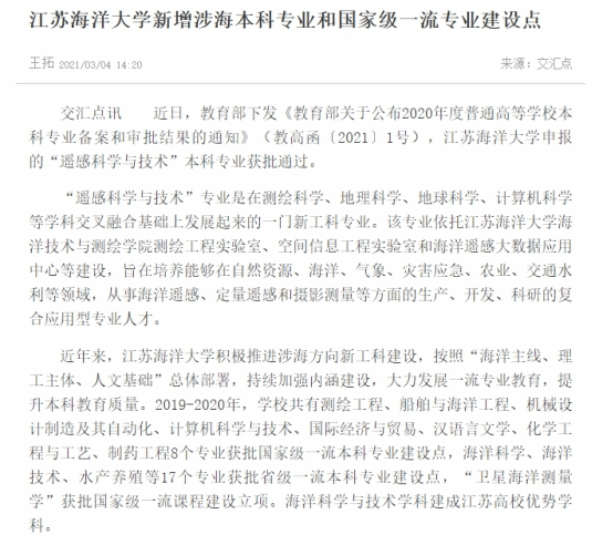 近日,教育部下发《教育部关于公布2020年度普通高等学校本科专业备案和审批结果的通知》(教高函〔2021〕1号),江苏海洋大学申报的“遥感科学与技术”本科专业获批通过。