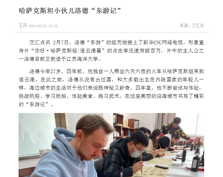 2月7日,洛德“东游”的经历被搬上了新华CNC网络电视,形象宣传片“你好·哈萨克斯坦|连云港篇”的点击率迅速突破百万,片中的主人公之一洛德目前正就读于江苏海洋大学。
