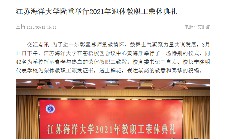 为了进一步彰显尊师重教情怀,鼓舞士气凝聚力量共谋发展,3月11日下午,江苏海洋大学在苍梧校区会议中心黄海厅举行了一场特别的仪式,向42名为学校挥洒青春与热血的荣休教职工致敬。校党委书记王自力、校长宁晓明代表学校为荣休教职工颁发证书,送上鲜花,表达崇高的敬意和真挚的祝福。