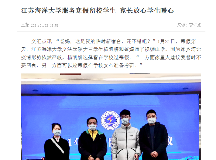 “爸妈,这是我的临时新宿舍,还不错吧?”1月21日,寒假第一天,江苏海洋大学文法学院大三学生杨凯妍和爸妈通了视频电话。因为家乡河北疫情形势依然严峻,杨凯妍选择留在学校过寒假,“一方面家里人建议我暂时不要回去,另一方面可以趁寒假在学校安心准备考研。”