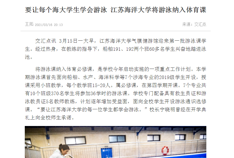 将游泳课纳入体育必修课,是学校今年启动实施的一项重点工作计划。本学期游泳课首先面向船舶、水产、海洋科学等7个涉海专业的2019级学生开设,授课采用小班教学,每个教学班15-20人。属必修课,在第四学期开课。7个专业共有10个班级370名学生将参加36学时的游泳课。学校专门配备具有救生员证和游泳教员证5名教师教练,计划逐年增加受益面,面向全校学生开设游泳通识选修课。“要让江苏海洋大学的每一位学生都学会游泳。”校长宁晓明曾经在开学典礼上向全校师生承诺。