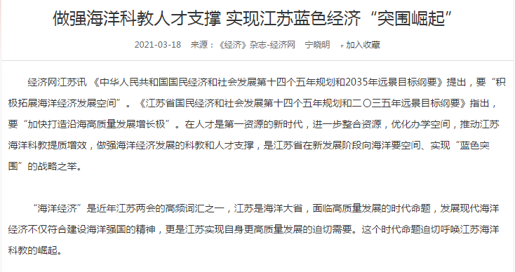 《江苏省国民经济和社会发展第十四个五年规划和二〇三五年远景目标纲要》提出,“要培育国家级海洋研究机构,支持建设海洋产业创新研究院和海洋技术产权交易平台,以江苏海洋大学等高校为依托,成立涉海产学研合作联盟。推进设立海洋产业子基金。”加快推进海洋科教资源整合与国际交流合作、提升海洋科教实力,是实现江苏海洋经济突围崛起的强力支撑。