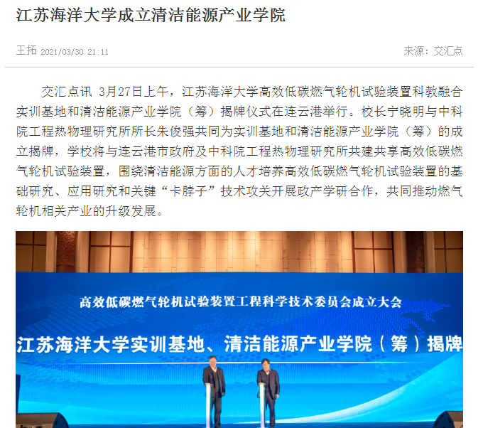 3月27日上午,江苏海洋大学高效低碳燃气轮机试验装置科教融合实训基地和清洁能源产业学院(筹)揭牌仪式在连云港举行。校长宁晓明与中科院工程热物理研究所所长朱俊强共同为实训基地和清洁能源产业学院(筹)的成立揭牌,学校将与连云港市政府及中科院工程热物理研究所共建共享高效低碳燃气轮机试验装置,围绕清洁能源方面的人才培养高效低碳燃气轮机试验装置的基础研究、应用研究和关键“卡脖子”技术攻关开展政产学研合作,共同推动燃气轮机相关产业的升级发展。