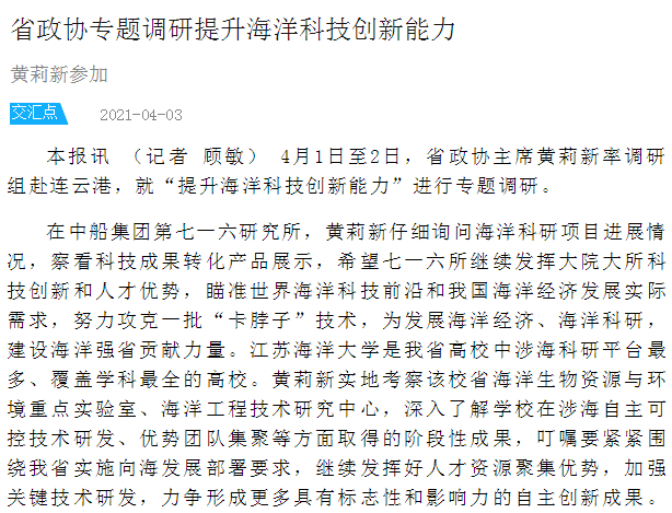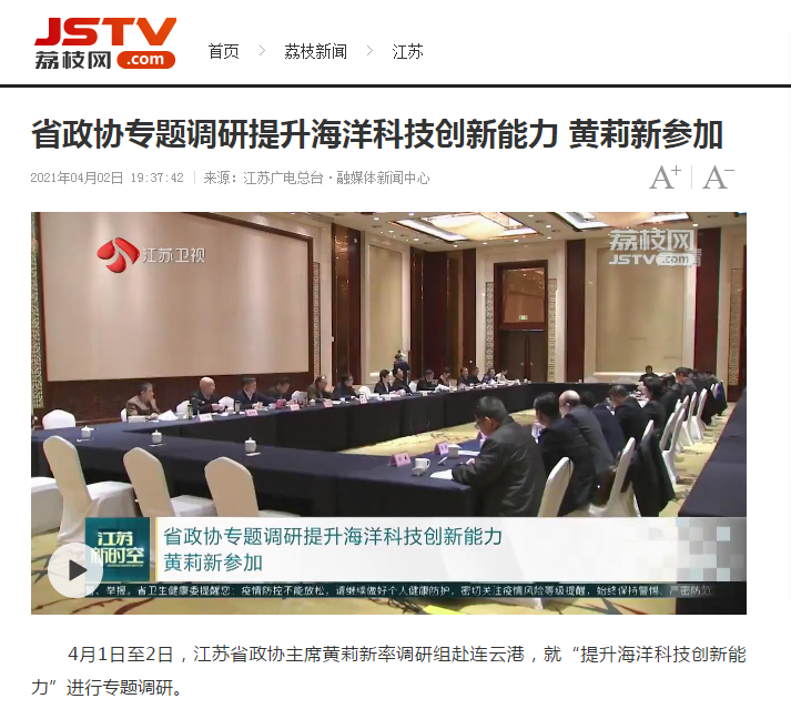 4月1日至2日,省政协主席黄莉新率调研组赴连云港,就“提升海洋科技创新能力”进行专题调研。