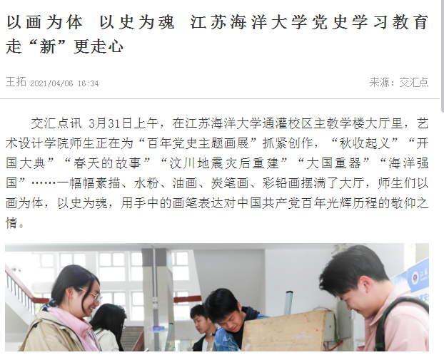 用艺术专业学生熟悉的语言宣传党史,讴歌了党的奋斗历程,让党史学习教育“润物无声”,是江苏海洋大学创新党史学习教育的一个缩影。连日来,学校各级党组织创新形式,扎实推进党史学习教育,将党史学习教育与专业教育、课程思政紧密结合,引导师生学史明理、学史增信、学史崇德、学史力行,激发青春奋斗力量,学习教育走“新”更走心。