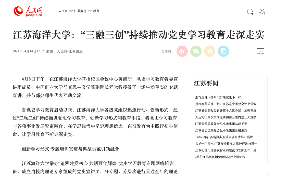 自党史学习教育启动以来,江苏海洋大学各级党组织迅速行动、创新形式,通过“三融三创”持续推进党史学习教育,创新学习形式和教育手段,将党史学习教育与各项事业发展紧密融合,在学思践悟中坚定理想信念,在奋发有为中践行初心使命,让学习教育不断走深走实。
