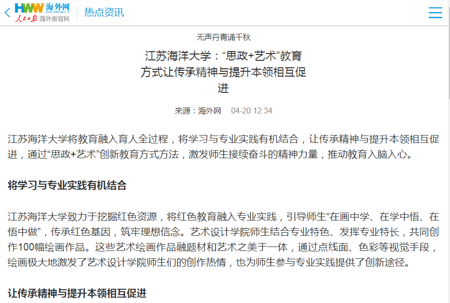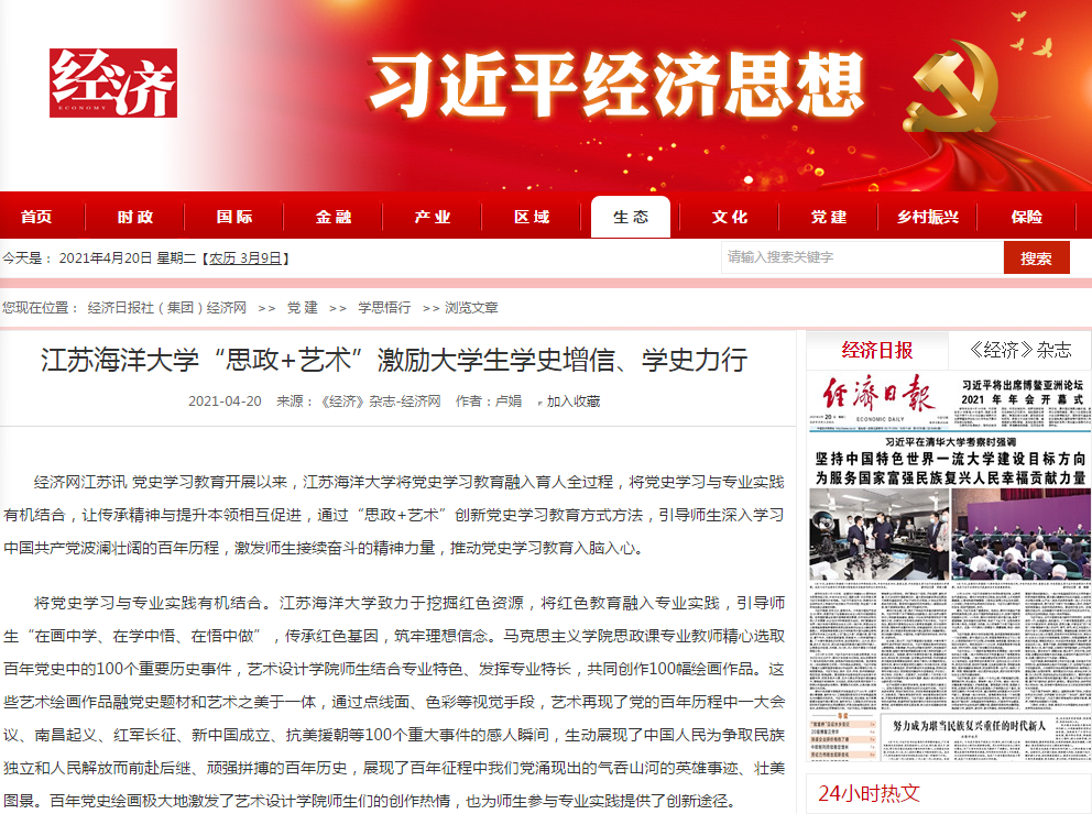 党史学习教育开展以来,江苏海洋大学将党史学习教育融入育人全过程,将党史学习与专业实践有机结合,让传承精神与提升本领相互促进,通过“思政+艺术”创新党史学习教育方式方法,引导师生深入学习中国共产党波澜壮阔的百年历程,激发师生接续奋斗的精神力量,推动党史学习教育入脑入心。