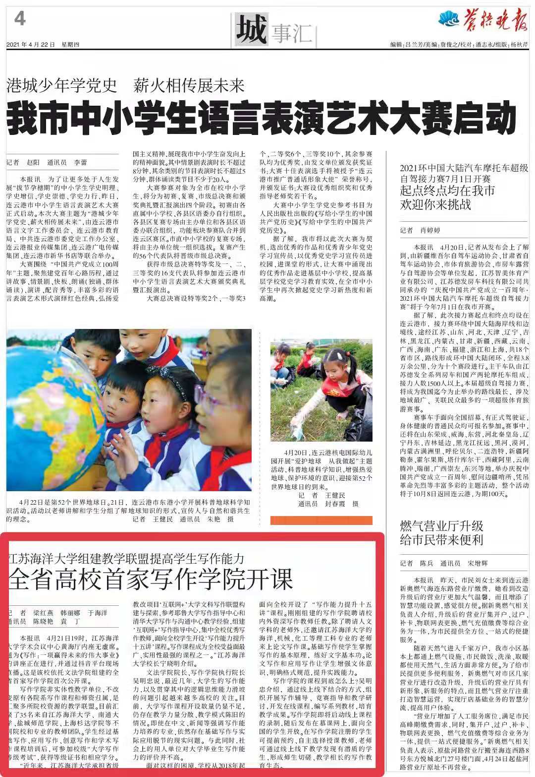 “近年来,江苏海洋大学承担省级教改项目‘互联网+’大学文科写作联盟构建与探索,参考耶鲁大学写作指导中心和清华大学写作与沟通中心教学经验,组建‘互联网+’写作指导中心,集中全校优秀写作教师,面向全校学生开设‘写作能力提升十五讲’课程。写作课程成为全校受益面最广、实用性最强的课程之一。”江苏海洋大学校长宁晓明介绍。