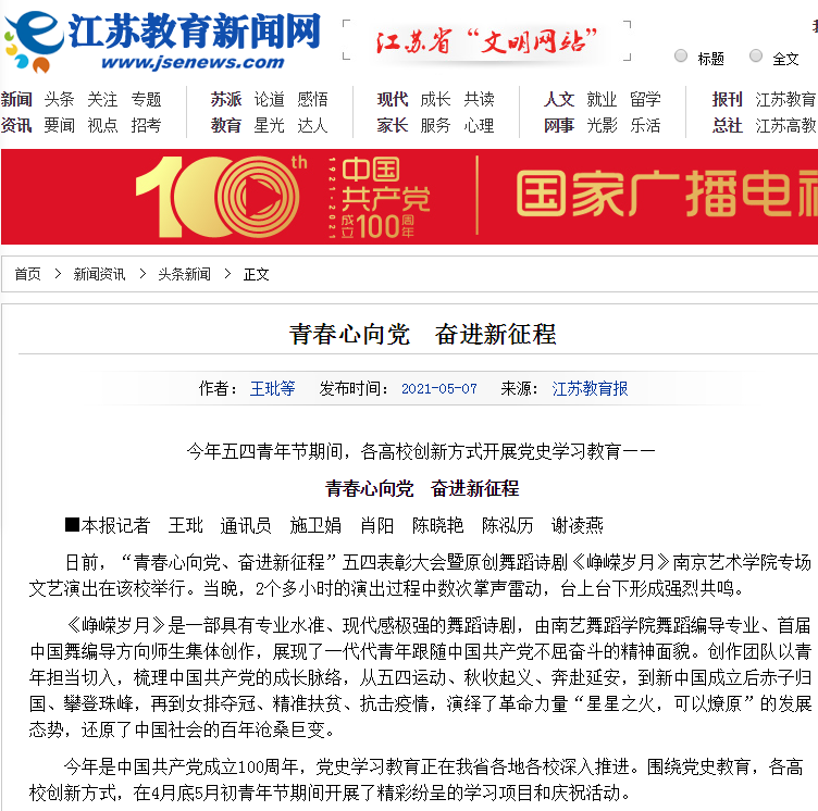 日前,“青春心向党、奋进新征程”五四表彰大会暨原创舞蹈诗剧《峥嵘岁月》南京艺术学院专场文艺演出在该校举行。当晚,2个多小时的演出过程中数次掌声雷动,台上台下形成强烈共鸣。