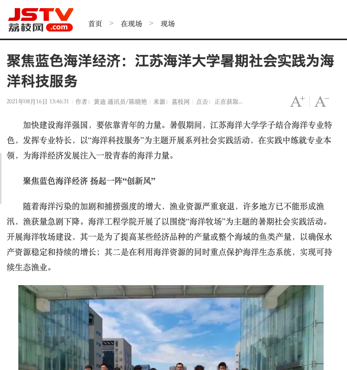 加快建设海洋强国,要依靠青年的力量。暑假期间,江苏海洋大学学子结合海洋专业特色,发挥专业特长,以“海洋科技服务”为主题开展系列社会实践活动,在实践中练就专业本领,为海洋经济发展注入一股青春的海洋力量。
