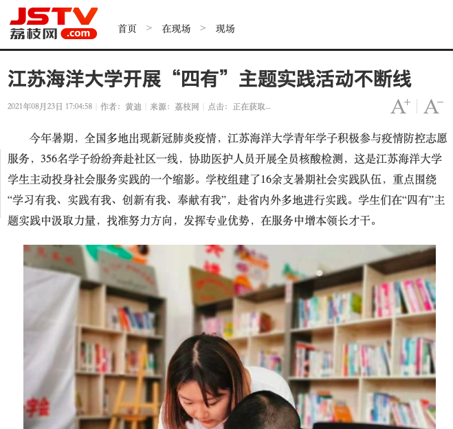 江苏海洋大学持续开展青年志愿服务系列活动,以暑期“三下乡”社会实践为契机,把党史学习教育学习成效转化为乡村教育、疫情防控、社区服务、乡村文明建设的实际行动,广大团员青年践行“奉献有我”,贡献青春力量。