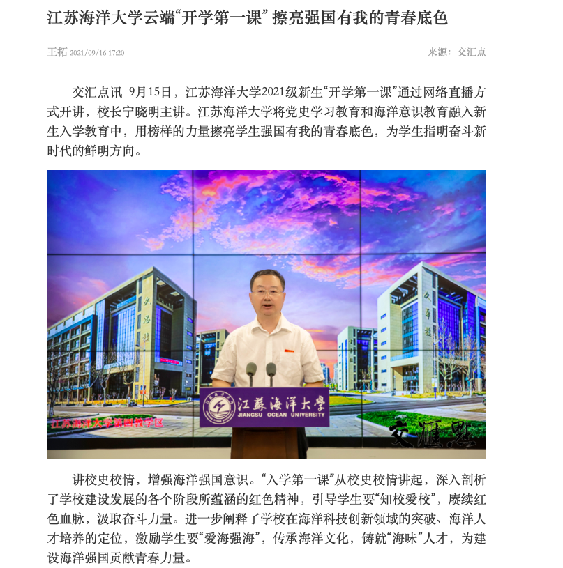 9月15日,江苏海洋大学2021级新生“开学第一课”通过网络直播方式开讲,校长宁晓明主讲。江苏海洋大学将党史学习教育和海洋意识教育融入新生入学教育中,用榜样的力量擦亮学生强国有我的青春底色,为学生指明奋斗新时代的鲜明方向。