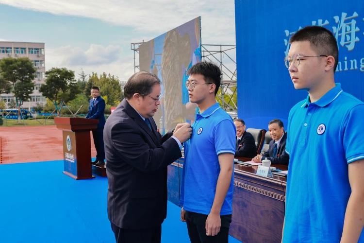 校党委书记王自力为每位新生准备了开学礼物——用蓝色丝带系扎的《新生寄语》,并为本科生、研究生新生代表授予、佩戴校徽。这份《新生寄语》饱含着学校对新生们的殷切期望;这枚校徽,不仅象征着6364名新同学正式成为海大的一员,也意味着我们将要共担海大人的使命,共创海大人的光荣。