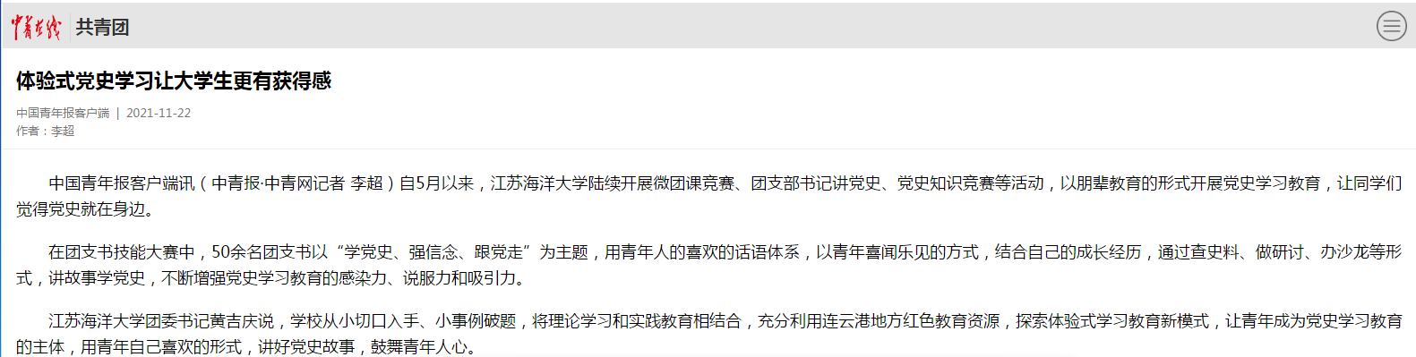 江苏海洋大学团委书记黄吉庆说,学校从小切口入手、小事例破题,将理论学习和实践教育相结合,充分利用连云港地方红色教育资源,探索体验式学习教育新模式,让青年成为党史学习教育的主体,用青年自己喜欢的形式,讲好党史故事,鼓舞青年人心。