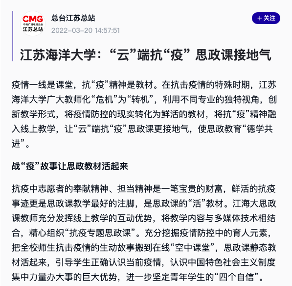 疫情一线是课堂,抗“疫”精神是教材。在抗击疫情的特殊时期,江苏海洋大学广大教师化“危机”为“转机”,利用不同专业的独特视角,创新教学形式,将疫情防控的现实转化为鲜活的教材,将抗“疫”精神融入线上教学,让“云”端抗“疫”思政课更接地气,使思政教育“德学共进”。