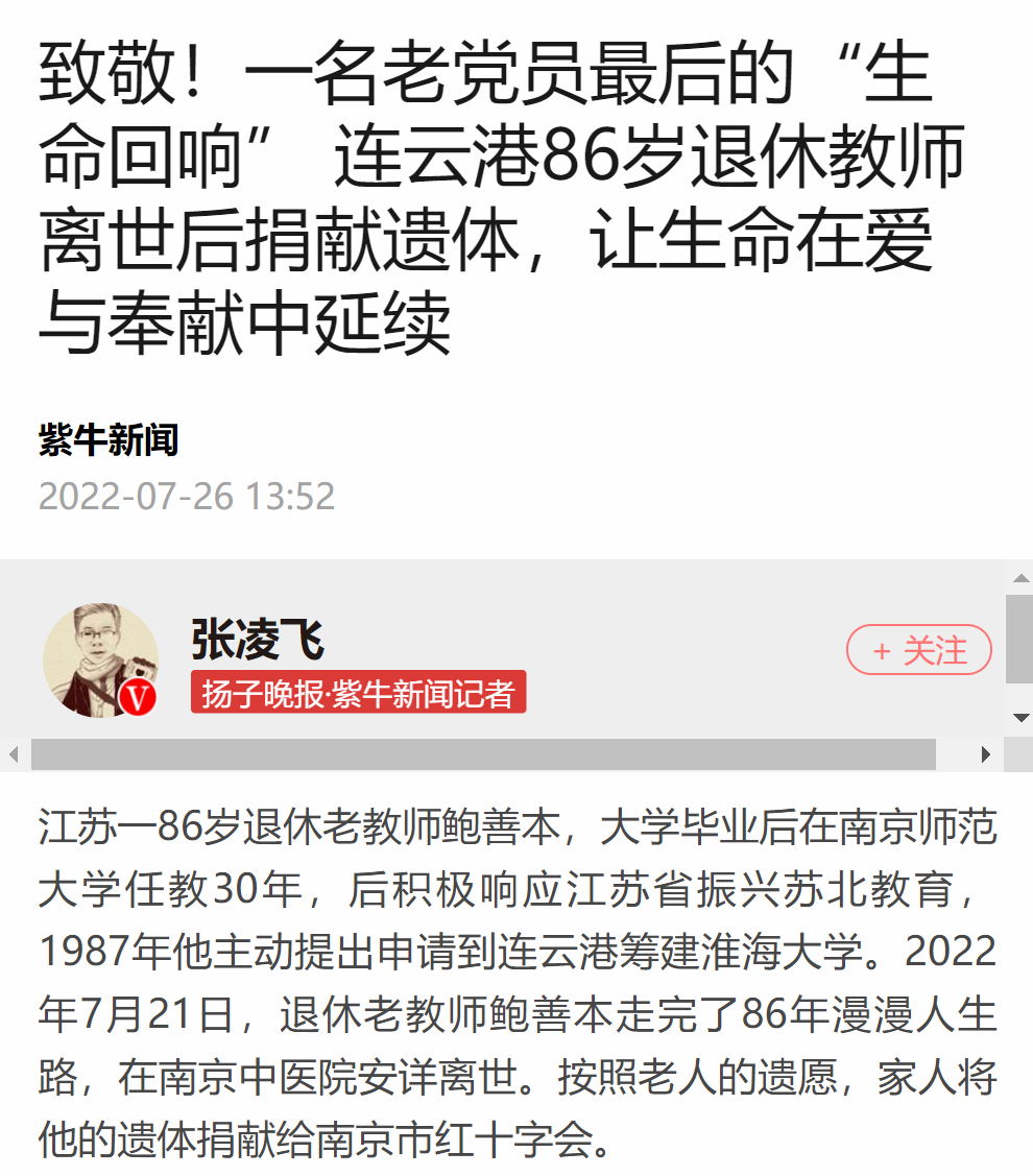 江苏一86岁退休老教师鲍善本,大学毕业后在南京师范大学任教30年,后积极响应江苏省振兴苏北教育,1987年他主动提出申请到连云港筹建淮海大学。2022年7月21日,退休老教师鲍善本走完了86年漫漫人生路,在南京中医院安详离世。按照老人的遗愿,家人将他的遗体捐献给南京市红十字会。