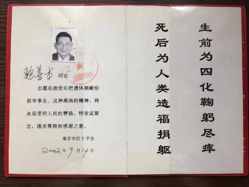 鲍善本作为新增遗体捐赠志愿者,即将成为东大医学院的一名无语体师,他的家人也将于8月到南京市遗体器官捐献者纪念林参加缅怀纪念仪式。
