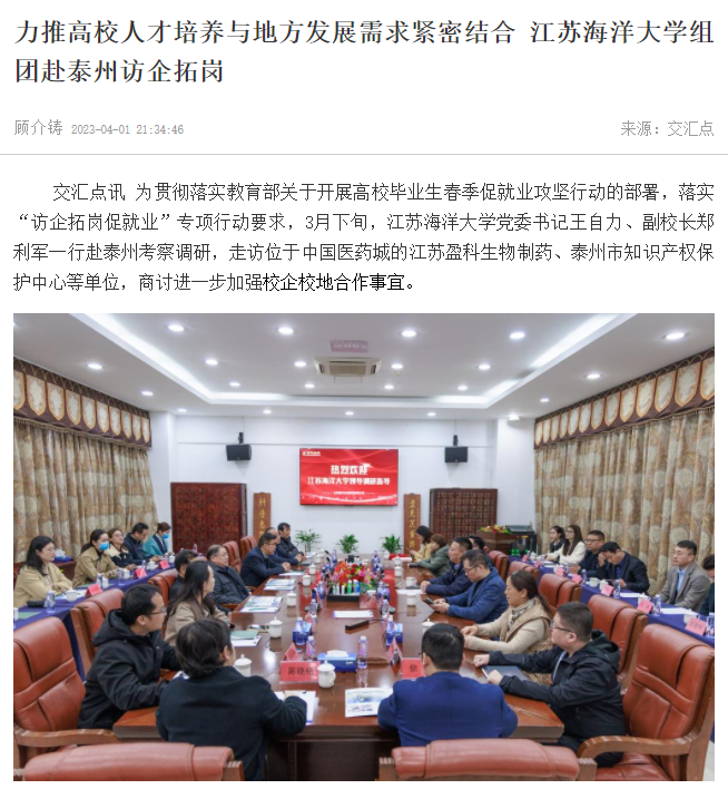 为贯彻落实教育部关于开展高校毕业生春季促就业攻坚行动的部署,落实“访企拓岗促就业”专项行动要求,3月下旬,江苏海洋大学党委书记王自力、副校长郑利军一行赴泰州考察调研,走访位于中国医药城的江苏盈科生物制药、泰州市知识产权保护中心等单位,商讨进一步加强校企校地合作事宜。