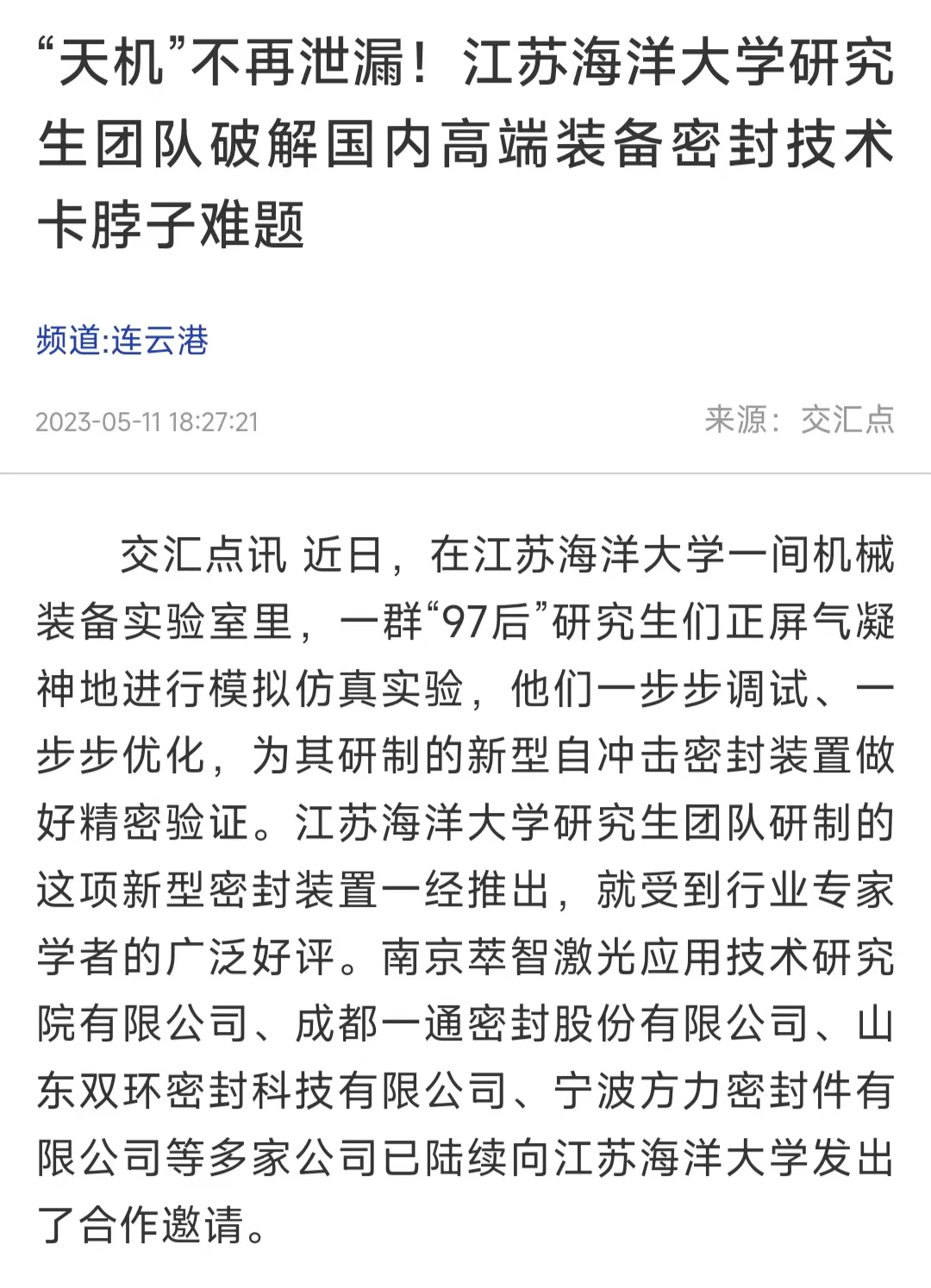 从“实验室”走进“生产线”,江苏海洋大学研究生团队将科技创新转化为产品创造。在这个新型密封装置研发的背后,有着原创密封技术的有力支撑,这也是实现国内高端装备密封核心技术攻关的关键。