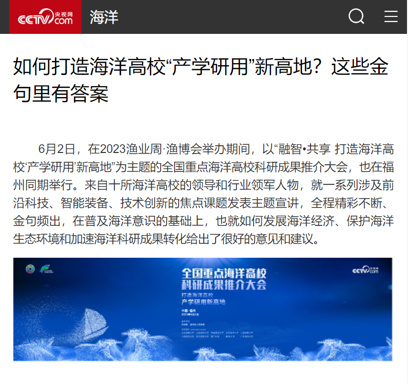 6月2日,在2023渔业周·渔博会举办期间,以“融智•共享 打造海洋高校‘产学研用’新高地”为主题的全国重点海洋高校科研成果推介大会,也在福州同期举行。来自十所海洋高校的领导和行业领军人物,就一系列涉及前沿科技、智能装备、技术创新的焦点课题发表主题宣讲,全程精彩不断、金句频出,在普及海洋意识的基础上,也就如何发展海洋经济、保护海洋生态环境和加速海洋科研成果转化给出了很好的意见和建议。