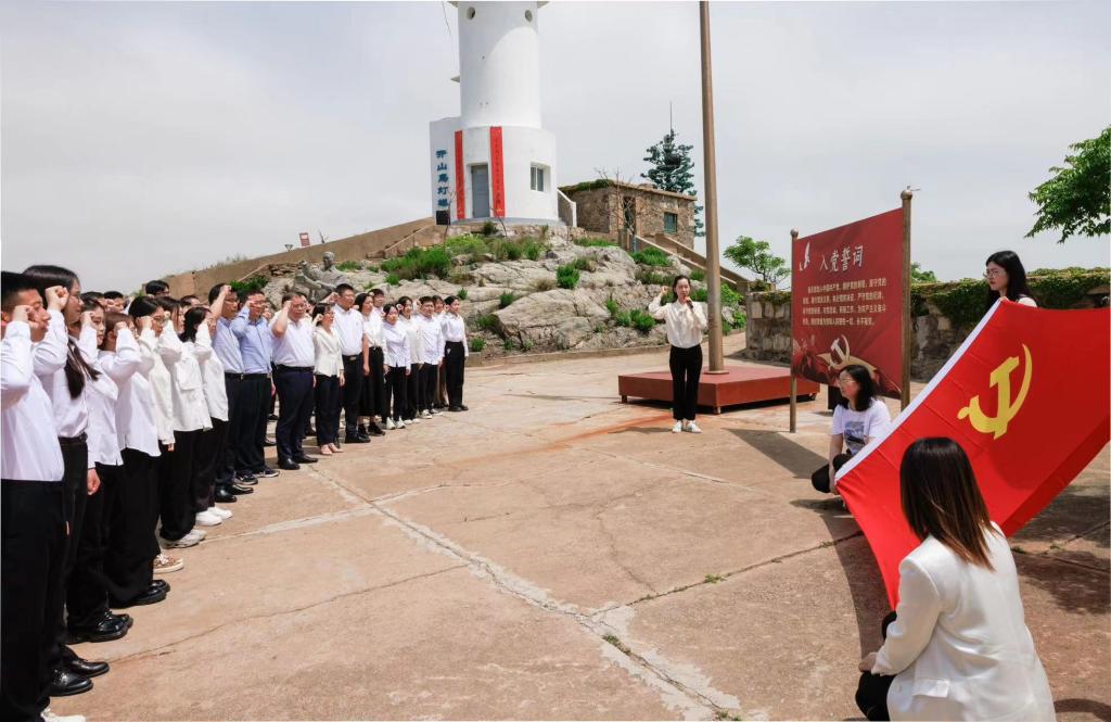 “我志愿加入中国共产党,拥护党的纲领,遵守党的章程……”在开山岛最高处的国旗广场上,全体党员师生整齐列队、庄严肃立,进行新党员入党宣誓,到场的所有党员同志一起重温入党誓词。