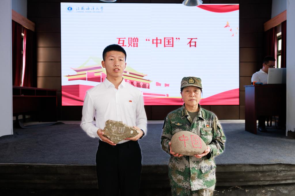 在楷模对话后,进行了黄海前哨开山岛“中国”石与西陲边疆冬古拉玛边境线上的“中国”石互赠的庄严仪式。陈建发代表人民楷模布茹玛汗·毛勒朵向开山岛夫妻哨事迹陈列馆捐赠“中国”石。王仕花向布茹玛汗·毛勒朵捐赠开山岛“中国”石,由陈建发代表布茹玛汗·毛勒朵郑重接收。