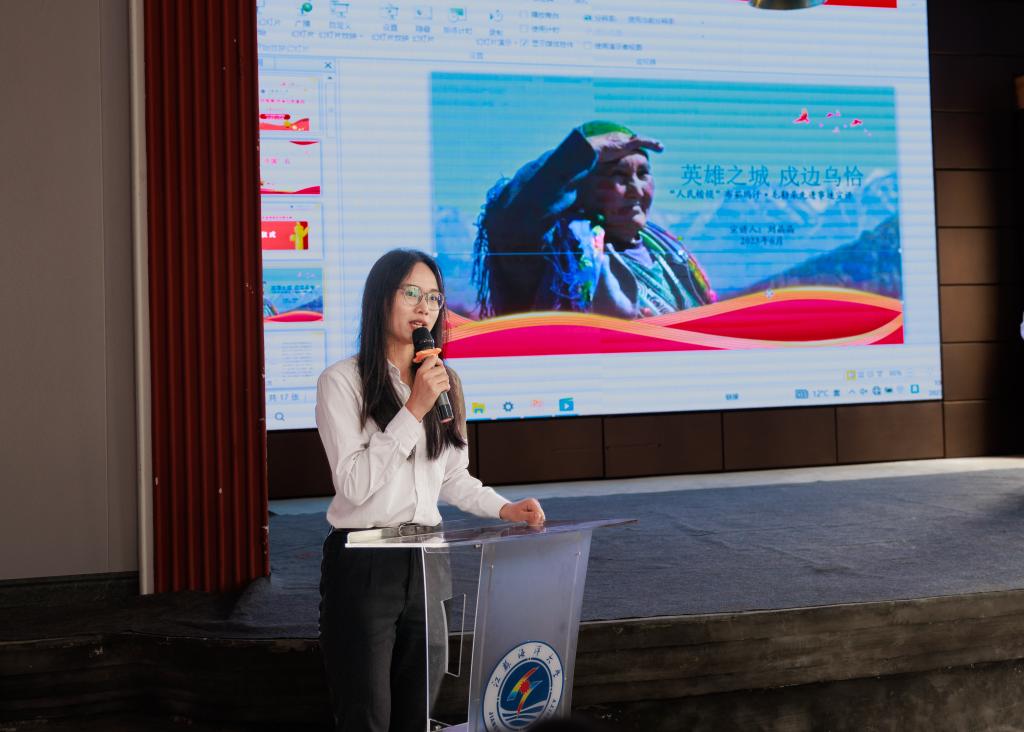 活动中还邀请了乌恰县吉根乡“护边光荣”爱国主义教育基地义务讲解员、江苏省优秀大学毕业生刘晶晶现场讲述了人民楷模布茹玛汗·毛勒朵半个多世纪放牧巡边在祖国最西端的感人事迹。在动情的讲解中,在场的师生们再一次接受了思想淬炼、爱国主义的精神洗礼。