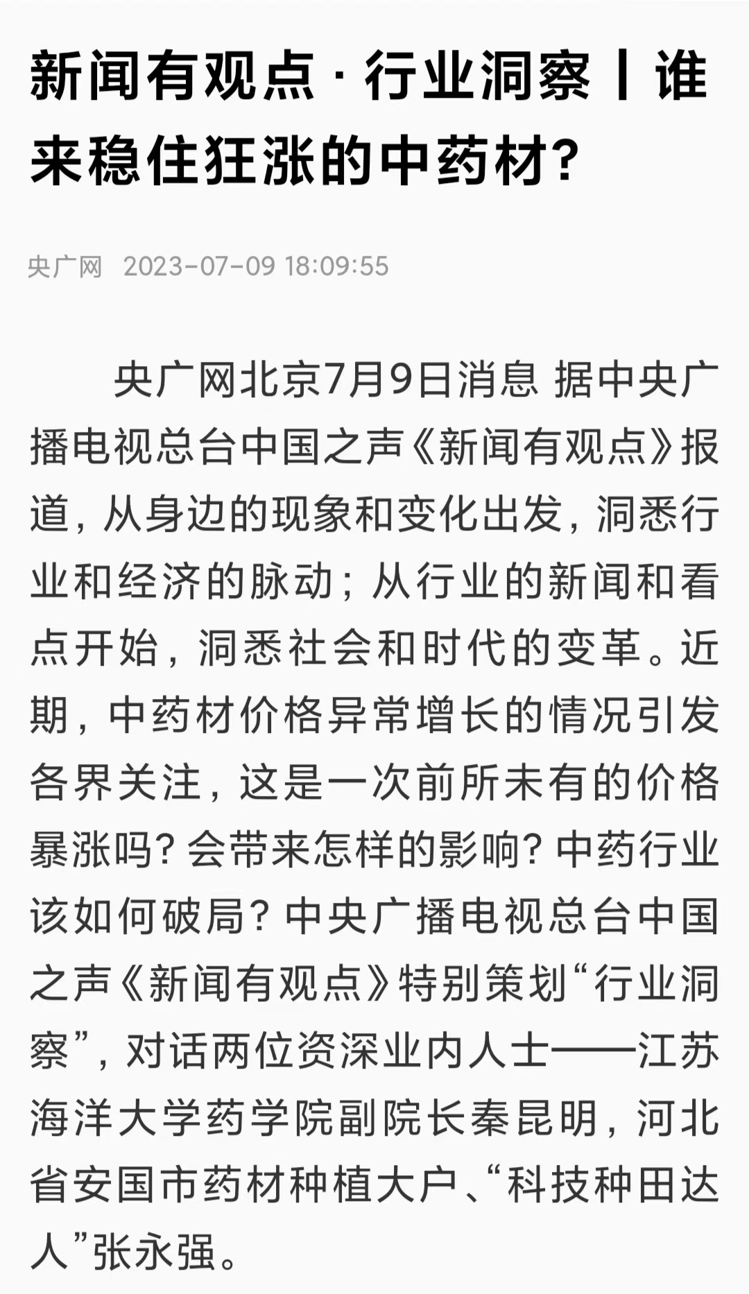 央广网北京7月9日消息 据中央广播电视总台中国之声《新闻有观点》报道,从身边的现象和变化出发,洞悉行业和经济的脉动;从行业的新闻和看点开始,洞悉社会和时代的变革。近期,中药材价格异常增长的情况引发各界关注,这是一次前所未有的价格暴涨吗?会带来怎样的影响?中药行业该如何破局?中央广播电视总台中国之声《新闻有观点》特别策划“行业洞察”,对话两位资深业内人士——江苏海洋大学药学院副院长秦昆明,河北省安国市药材种植大户、“科技种田达人”张永强。