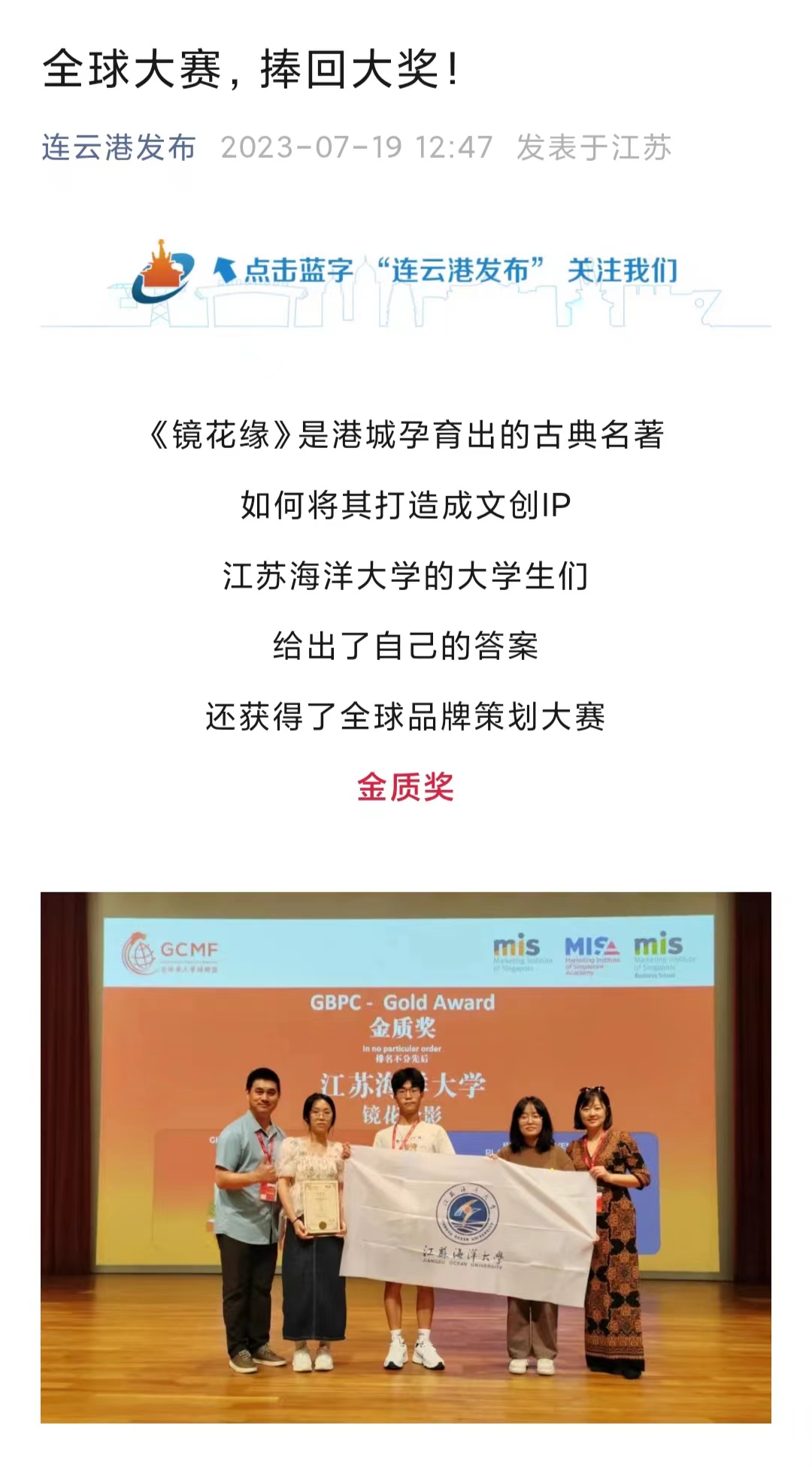 近日,全国高校商业精英挑战赛“中图科信杯”品牌策划竞赛暨(新加坡)全球品牌策划大赛全球总决赛在新加坡举行。来自江苏海洋大学的东家智创团队师生在比赛中脱颖而出,荣获金质奖。