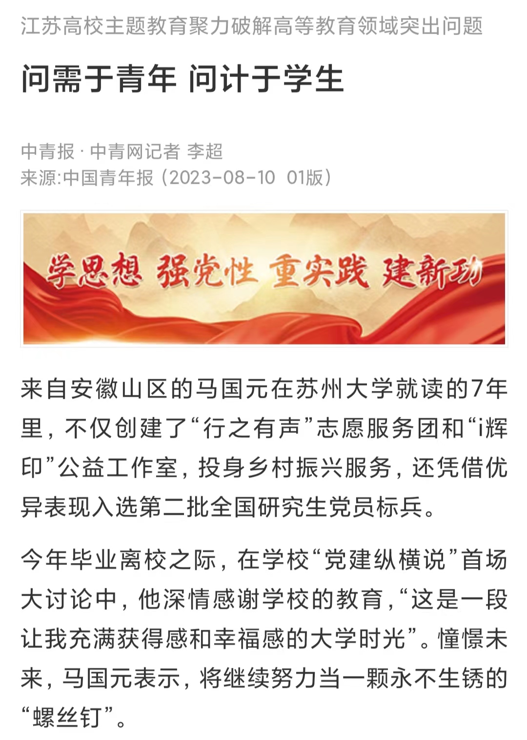来自安徽山区的马国元在苏州大学就读的7年里,不仅创建了“行之有声”志愿服务团和“i辉印”公益工作室,投身乡村振兴服务,还凭借优异表现入选第二批全国研究生党员标兵。