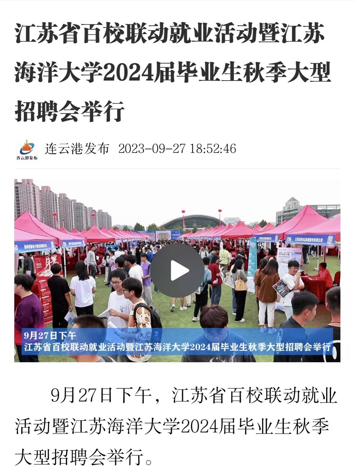 9月27日下午,江苏省百校联动就业活动暨江苏海洋大学2024届毕业生秋季大型招聘会举行。