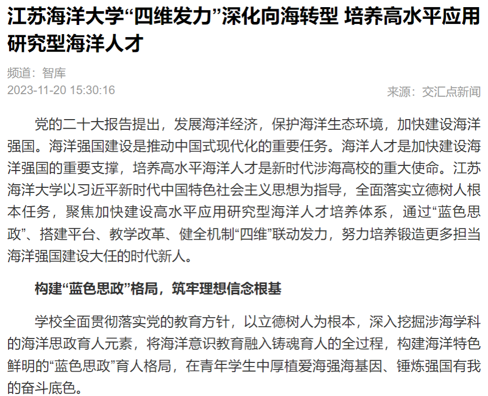 党的二十大报告提出,发展海洋经济,保护海洋生态环境,加快建设海洋强国。海洋强国建设是推动中国式现代化的重要任务。海洋人才是加快建设海洋强国的重要支撑,培养高水平海洋人才是新时代涉海高校的重大使命。江苏海洋大学以习近平新时代中国特色社会主义思想为指导,全面落实立德树人根本任务,聚焦加快建设高水平应用研究型海洋人才培养体系,通过“蓝色思政”、搭建平台、教学改革、健全机制“四维”联动发力,努力培养锻造更多担当海洋强国建设大任的时代新人。