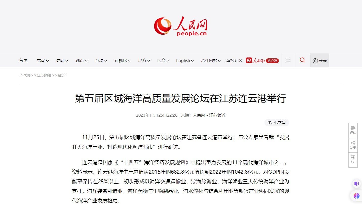 11月25日,第五届区域海洋高质量发展论坛在江苏省连云港市举行,与会专家学者就“发展壮大海洋产业,打造现代化海洋强市”进行研讨。