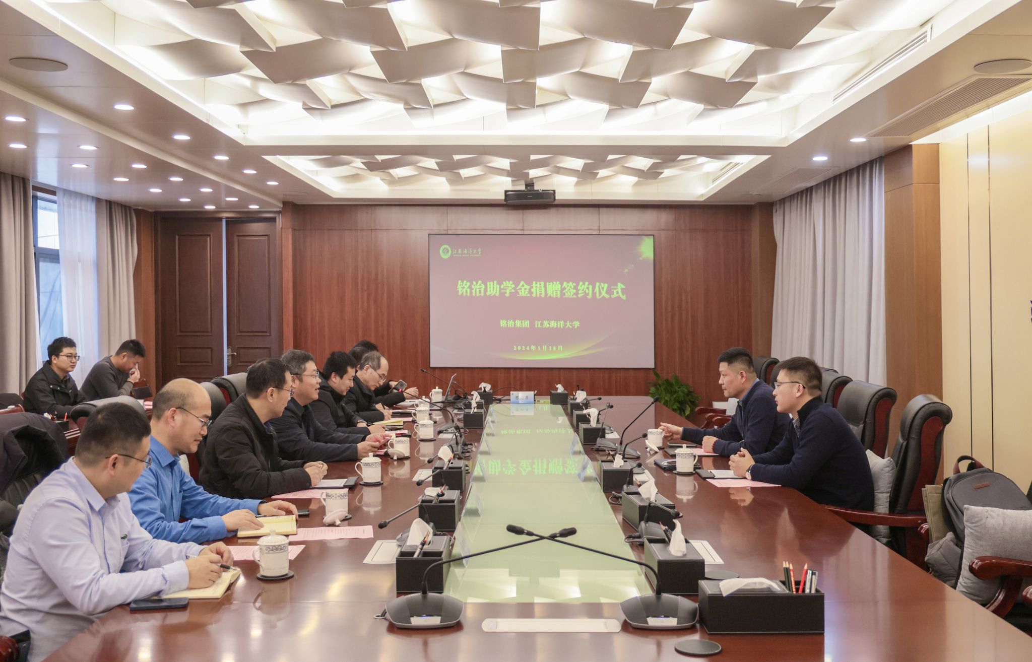“老师的无私教诲和同学的真诚帮助激发了我创业奋斗、回报社会的信念,此次捐资助学就是想为学校的发展出一份力,为更多困难学生提供帮助,引导学弟学妹努力成长为肯奋斗、懂感恩、知回报的社会栋梁。”1月18日,江苏海洋大学海洋科学与水产学院水产2002级校友、铭治集团副总裁李涛,生物技术2008级校友、铭治集团河蟹产业链负责人赵大伟返回母校,捐赠100万元人民币,以企业名义设立“铭治助学金”。捐赠仪式在行政楼五楼会议室举行。