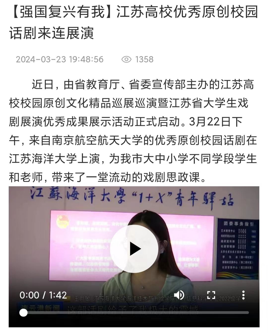 近日,由省教育厅、省委宣传部主办的江苏高校校园原创文化精品巡展巡演暨江苏省大学生戏剧展演优秀成果展示活动正式启动。3月22日下午,来自南京航空航天大学的优秀原创校园话剧在江苏海洋大学上演,为我市大中小学不同学段学生和老师,带来了一堂流动的戏剧思政课。