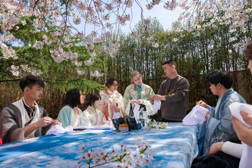3月31日,在江苏连云港,留学生在江苏海洋大学上“蓝染”体验课。