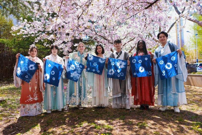 3月31日,在江苏连云港,留学生在江苏海洋大学手持“蓝染”课作品合照。