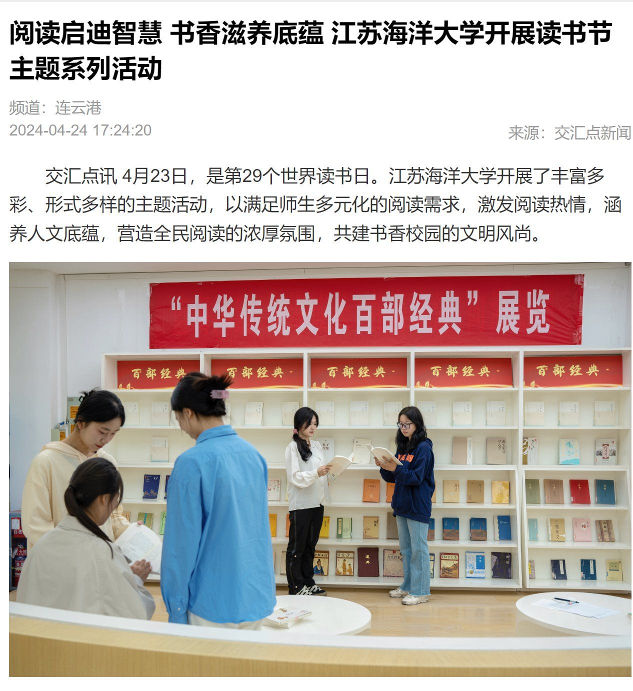 4月23日,是第29个世界读书日。江苏海洋大学开展了丰富多彩、形式多样的主题活动,以满足师生多元化的阅读需求,激发阅读热情,涵养人文底蕴,营造全民阅读的浓厚氛围,共建书香校园的文明风尚。